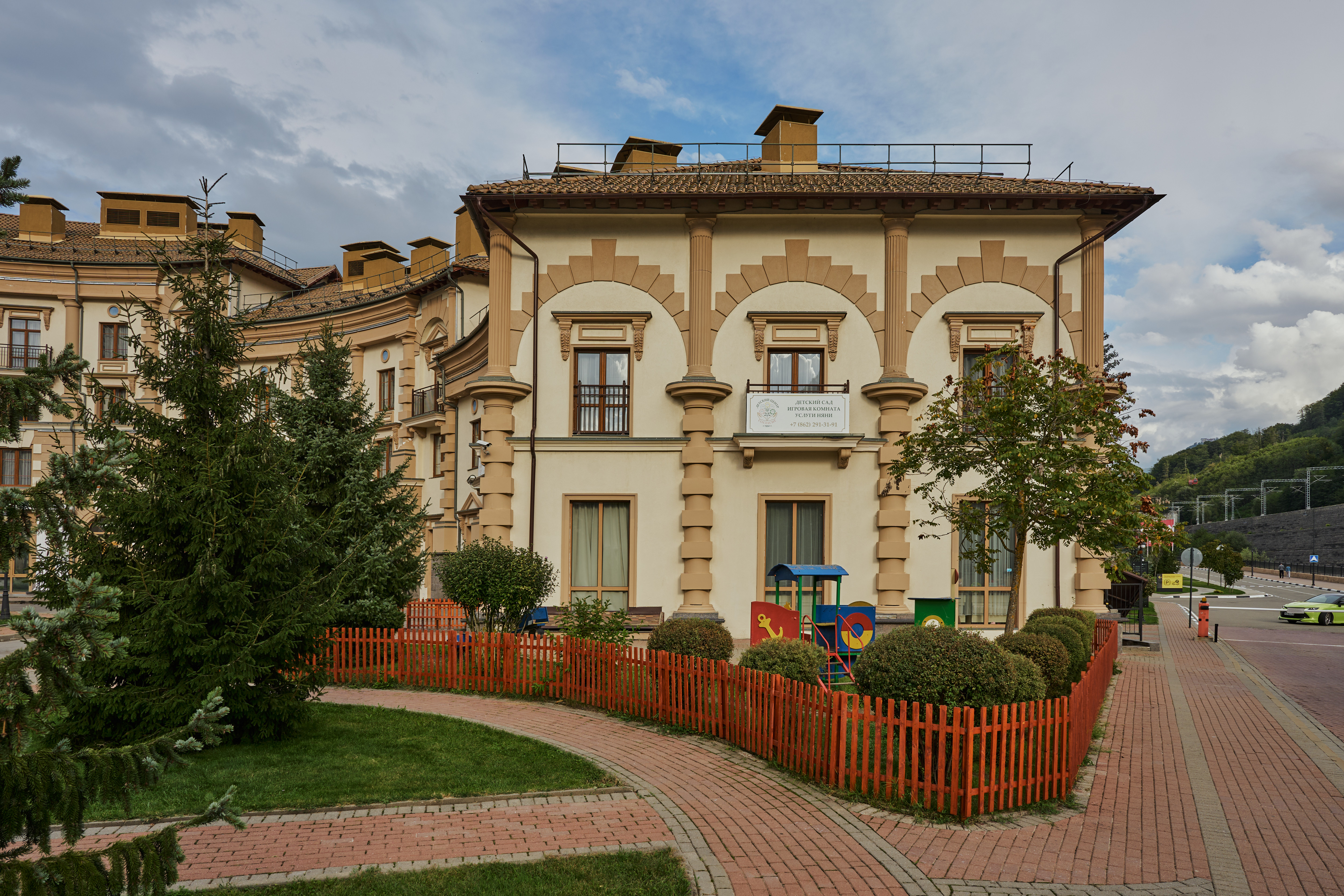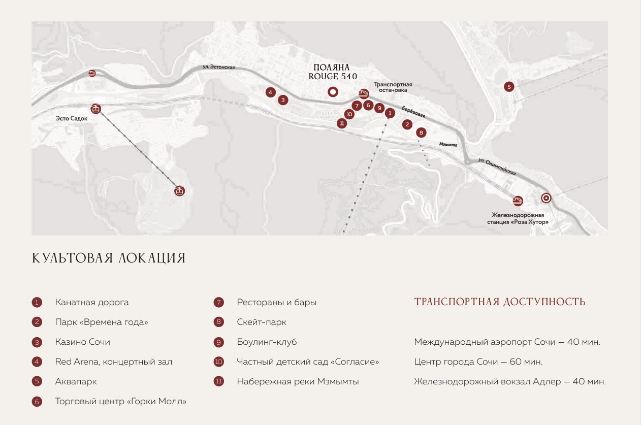 Премиальная резиденция расположена в самом центре круглогодичного курорта Красная Поляна, в окружении великолепных гор и в непосредственной близости к современной инфраструктуре курорта.