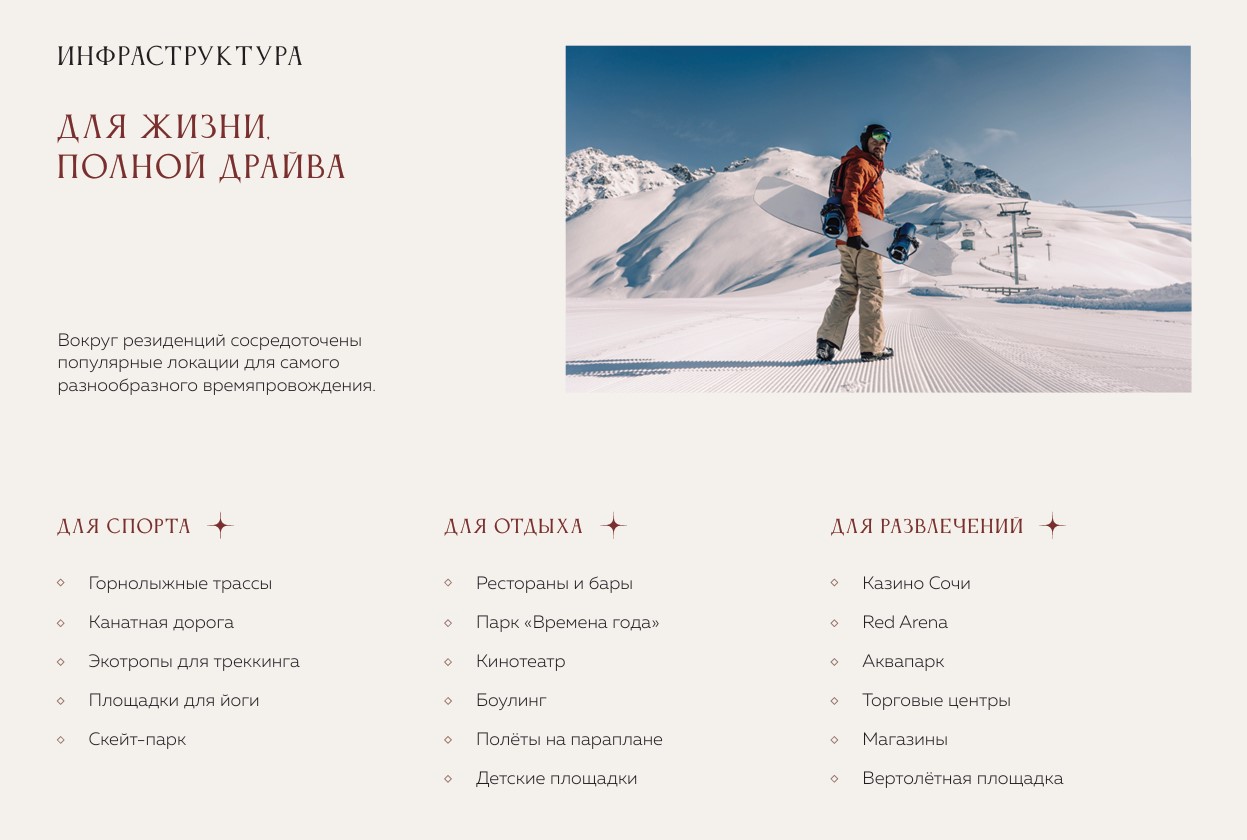 Расположение в центре самого популярного в России всесезонного Курорта Красная Поляна. Круглогодичная загрузка курорта — 90%