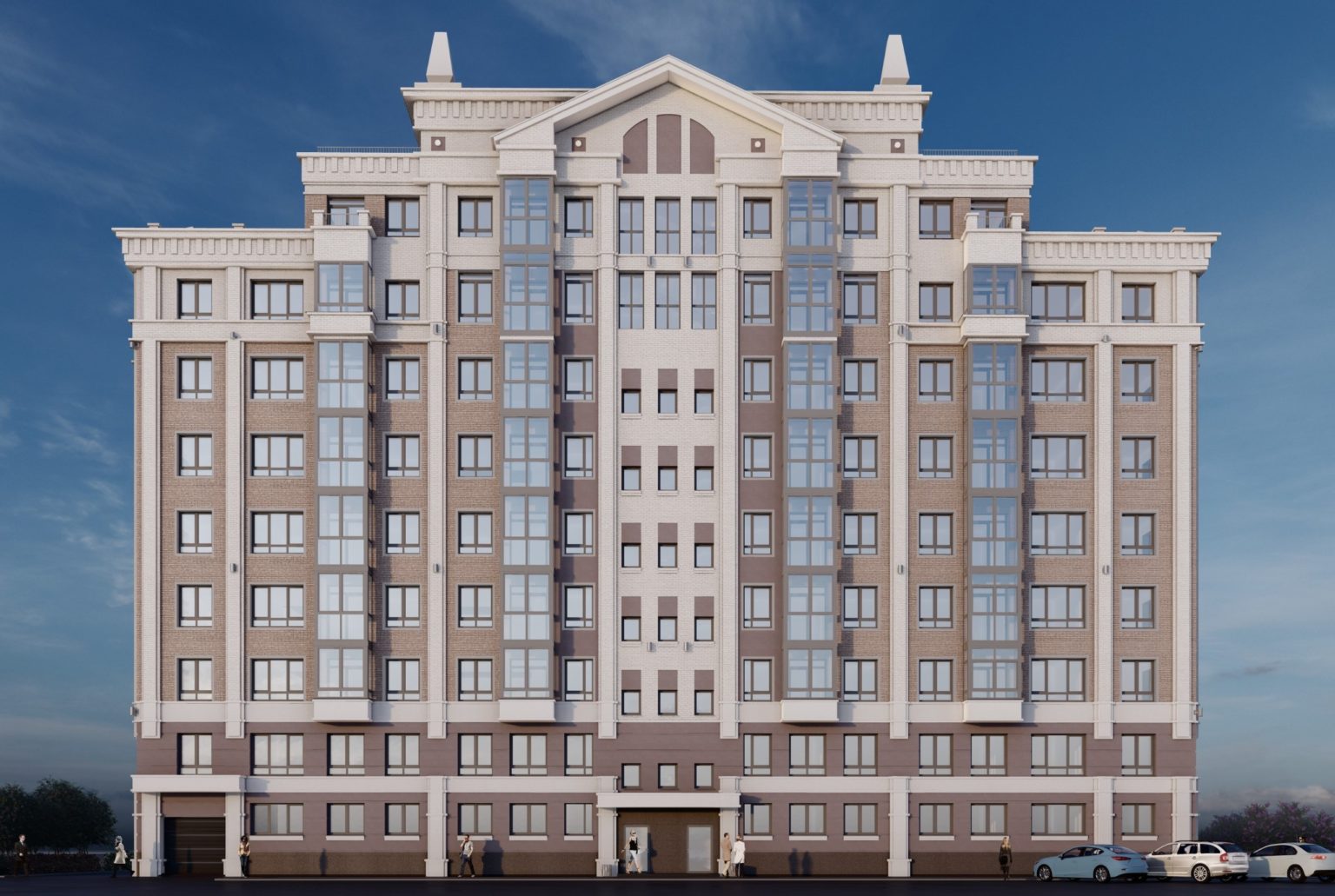- Новый кирпичный дом с классической архитектурой и просторными квартирами.