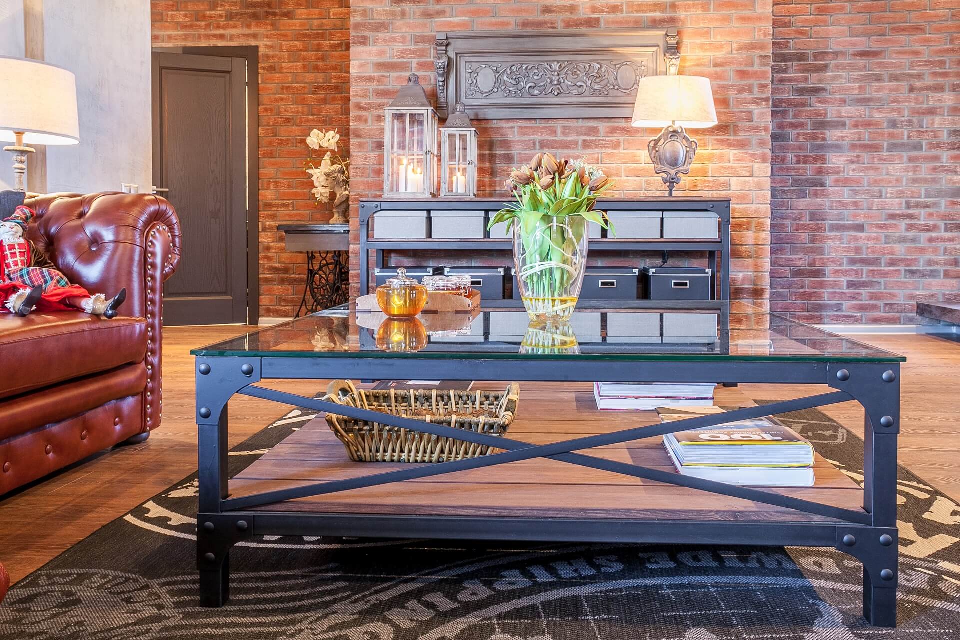 Мебель в гостиной выполнена по индивидуальному заказу. В отделке использованы материалы, характерные для стиля лофт: клинкерный кирпич, состаренный вручную, грубая штукатурка под бетон, дерево. Особую атмосферу создаёт двусторонний биокамин из гостиной в спальню.